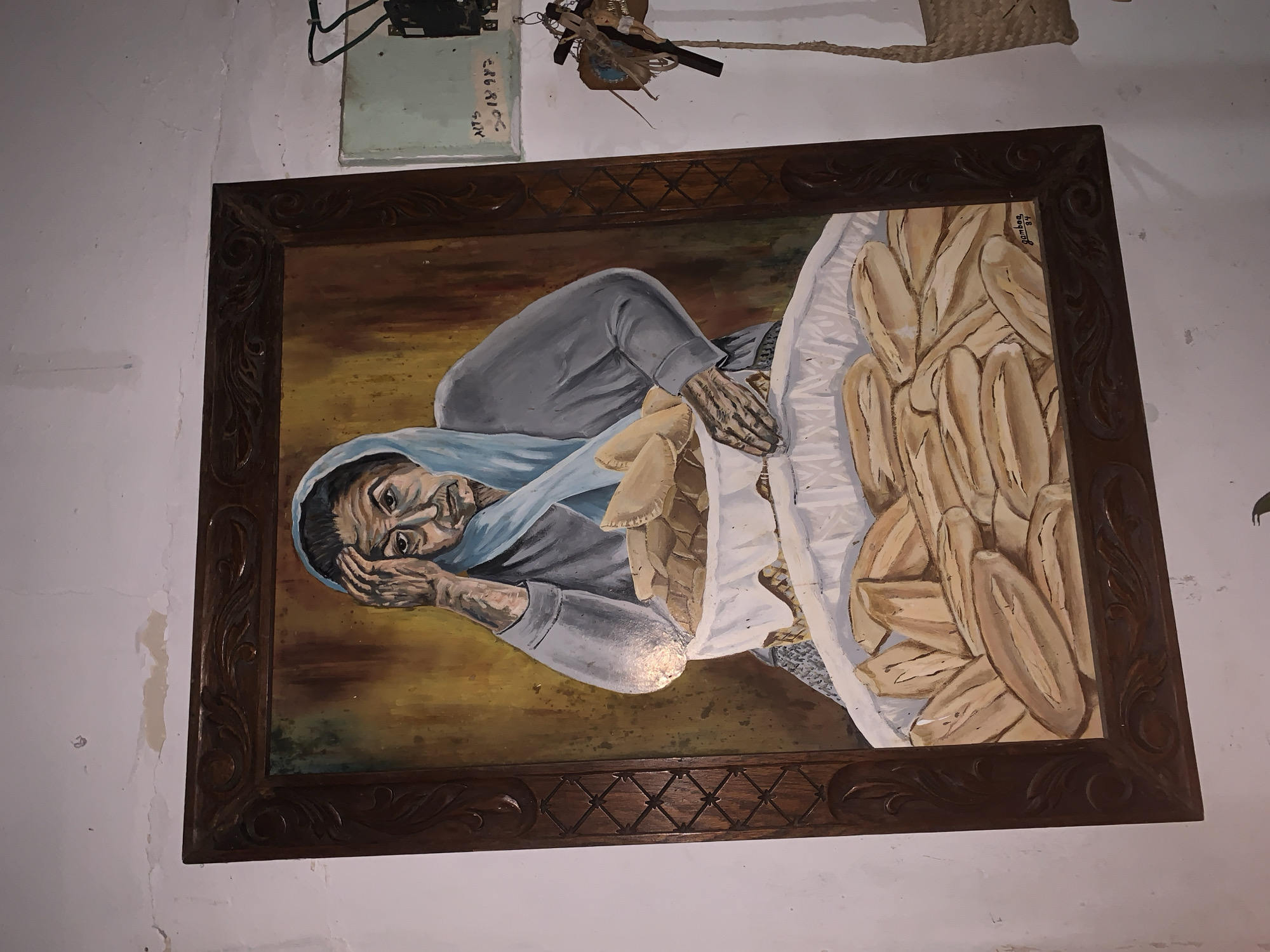 A framed painting hangs on a white wall. The painting depicts an elderly woman in a headscarf, looking distressed and resting her head on her hand. Beside her is a large sack filled with bread or similar food items. The frame is dark brown with ornate carvings. Above the painting are some electrical wiring and a small hanging decoration. The image suggests a scene reflecting poverty or hardship related to food. I cannot verify the location in Santa Ana, Venezuela without further evidence.