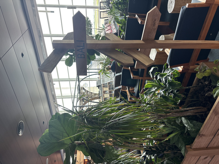 The image captures an indoor airport lounge or waiting area within Aeropuerto Internacional Ezeiza, Argentina. In the immediate foreground, a rectangular wooden planter holds a variety of green foliage plants, including a prominent Fiddle-leaf fig and several Dracaena specimens. Adjacent to the planter on the right, a wooden signpost stands upright, featuring multiple arrow-shaped signs; one sign prominently displays "BALI" and points right. The midground is furnished with numerous dark-cushioned armchairs with wooden frames, arranged in an open seating configuration, interspersed with small wooden side tables, some resembling tree stumps. One individual, wearing a dark garment, is seated in one of these armchairs, facing away from the camera. To the left in the midground, a decorative structure composed of curved wooden arches and shelving is visible. The background consists of large, multi-pane windows providing a view of an outdoor airport tarmac or runway under bright conditions. The ceiling features recessed panels and circular air vents.