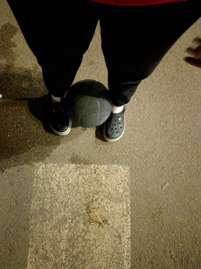 A low-angle, top-down perspective captures the lower body of an individual standing on a paved ground surface in Meknes, Morocco. The person wears black trousers, white socks, a dark-colored sneaker on their left foot, and a dark grey Crocs-style sandal on their right foot. A partially deflated dark-colored ball rests between their feet. A faint glimpse of a reddish garment is visible at the top edge, and a blurred right hand with a subtle yellowish tint on a finger is present in the upper right. The ground is an uneven light grey asphalt or concrete, exhibiting patches of dampness or liquid stains to the left of the feet and a distinct rectangular area of rougher, lighter-colored aggregate in the foreground. A small, irregular white piece of debris lies on the ground in the lower right corner. The scene is illuminated by an artificial light source, casting distinct shadows. The exact sub-location within Meknes, Morocco, is not discernible from the provided visual information.