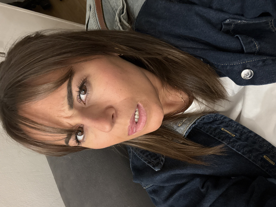 A woman with brown hair and bangs peers at the camera. She has fair skin, brown eyes, and glossy lips. She wears a denim jacket over a white shirt. A thin gold necklace is visible. Her expression suggests slight amusement or skepticism. The image is taken at an angle, potentially a selfie.