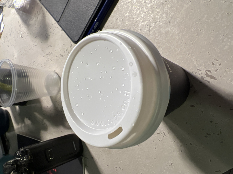 A top-down view shows a covered coffee cup with condensation droplets on its white lid