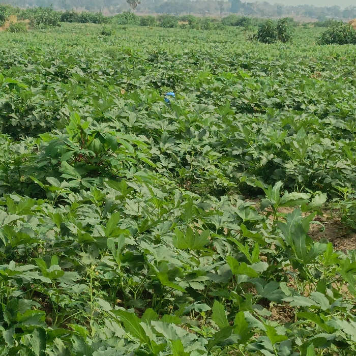 This image depicts an agricultural field located in Shendam, Nigeria, under clear daylight conditions. The scene is dominated by a dense cultivation of green-leafed plants, consistent with okra crops, extending from the foreground to the distant horizon. Individual plant leaves are broad and deeply lobed, exhibiting various shades of green. Exposed soil, light brown in color, is minimally visible between the plants. Approximately one-third of the way from the top edge and slightly left of center, a small, irregularly shaped blue object is partially obscured by the foliage. The background consists of a hazy, light-toned horizon line, above which indistinct vegetation or trees are visible, suggesting a distant landscape. No individuals, animals, or specific actions are discernible within the frame.