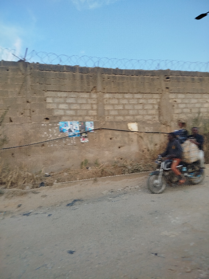 A concrete wall topped with barbed wire is adjacent to a dirt road. Posters are affixed to the wall. A motorcycle with three people, including a passenger carrying a large sack, moves along the road. The sky is light blue with scattered clouds. A dark bird is visible in the upper right.