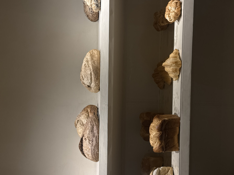 The image displays a two-tiered bakery shelf stocked with various baked goods, situated within what is identified as a retail space in Mexico City, Mexico. The background consists of a plain, light beige or off-white wall, consistent with minimalist interior design. The shelves themselves are light-colored and appear to be made of concrete or a similar material. On the upper shelf, six loaves of artisanal bread are arranged. From left to right: two round loaves with dark, rustic crusts, one positioned slightly behind the other; followed by three lighter-colored, round loaves; and a partially visible sixth loaf with a textured crust at the far right. All loaves exhibit characteristic scoring marks on their upper surfaces. The lower shelf presents a different assortment of baked goods. On the left, a prominent tall, rectangular loaf of pull-apart bread with a golden-brown, wavy top is visible, with additional similar loaves partially obscured behind it. To the right, at least five pastries are displayed: three distinct crescent-shaped croissants with flaky, golden-brown exteriors, and two more irregularly shaped, lighter-toned pastries that resemble twisted or knotted bread. No individuals, explicit actions, or interactions are depicted in the scene. The lighting is soft and ambient, casting gentle shadows and highlighting the textures of the baked goods.