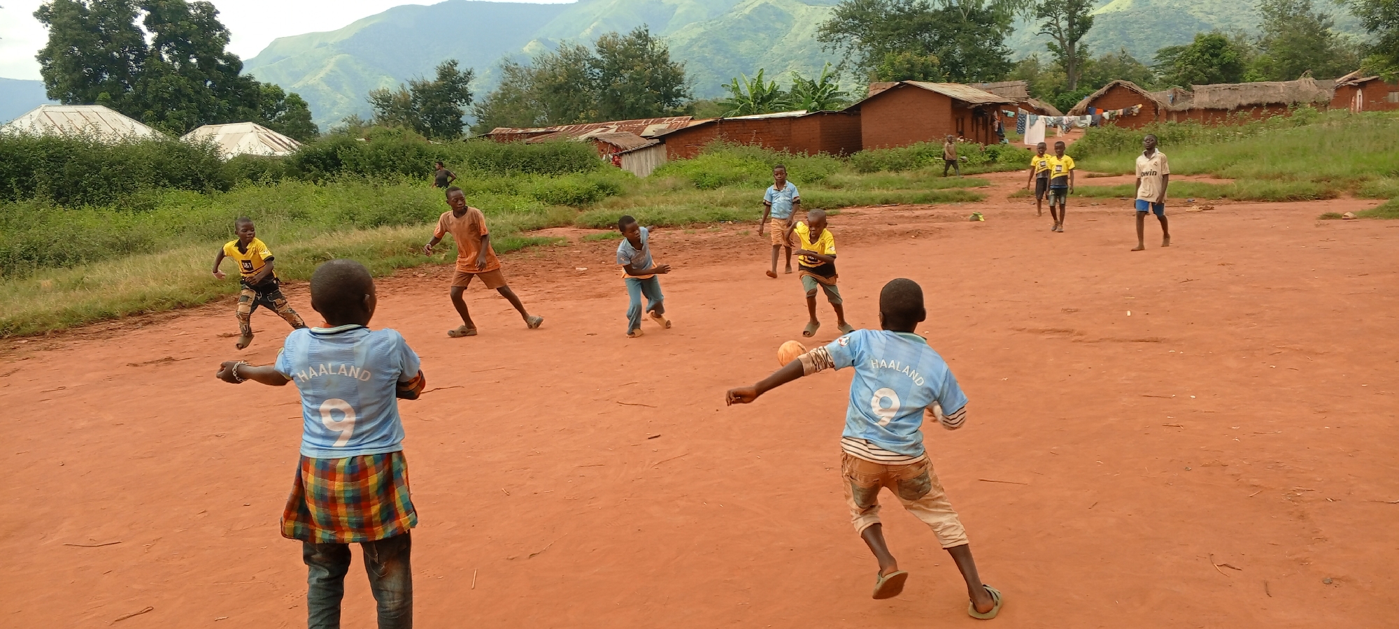 Boys play soccer on a dirt field in the city of Ngalula, Democratic Republic of the Congo. Mountains and vegetation are in the background. Buildings with straw roofs are visible in the background. One boy kicks a soccer ball. Several boys wear soccer jerseys.
