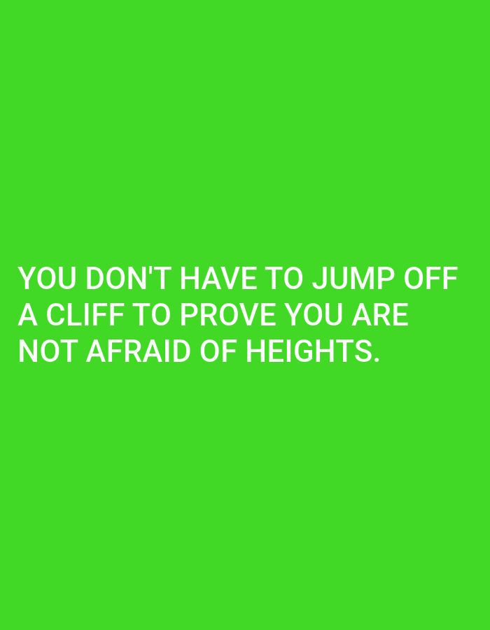 The image displays white sans-serif text centered on a solid, bright green background. The text reads: "YOU DON'T HAVE TO JUMP OFF A CLIFF TO PROVE YOU ARE NOT AFRAID OF HEIGHTS." There are no people, subjects, objects, actions, or interactions depicted. The environment is abstract, consisting solely of the colored background and text. No specific location in the city of Unknown, Unknown, is identifiable.