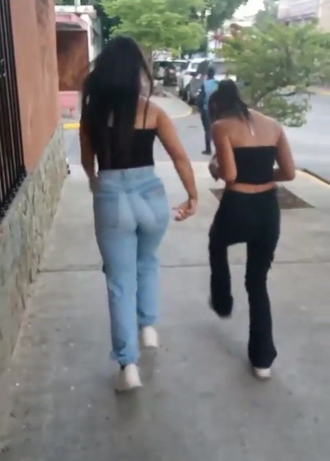 Two young women are seen walking away from the camera on a sidewalk next to a building. The woman on the left has long, dark hair and is wearing a black tank top and light-wash jeans. The woman on the right also has long, dark hair tied in a ponytail and is wearing a black tube top and black pants. They are initially seen holding hands, and then proceed to walk, alternating between skipping and walking. In the background, there are parked cars, a tree, and people standing on the street. The building adjacent to the sidewalk is a peach color.