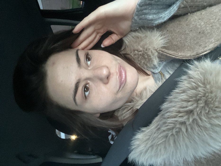 An adult female is depicted from the mid-torso up, seated inside a vehicle, likely a car. She has light brown hair, brown eyes, and a fair complexion, with a visible blemish on her forehead. Her lips appear slightly parted with a glossy finish, and she displays a subtle smirk or pout. Her gaze is directed towards the viewer's right. She is wearing a light-colored, possibly beige, furry or faux fur vest over a gray knitted garment. A dark seatbelt crosses diagonally from her left shoulder to her right hip. Her left hand is raised, with fingers splayed, and rests against her left temple/forehead area. The vehicle's interior appears dark. Through the windows in the blurred background, a distant light source and faint indications of an outdoor environment are visible. The specific location within Villeneuve-d'Ascq, France, cannot be determined from the visual information provided in the image.