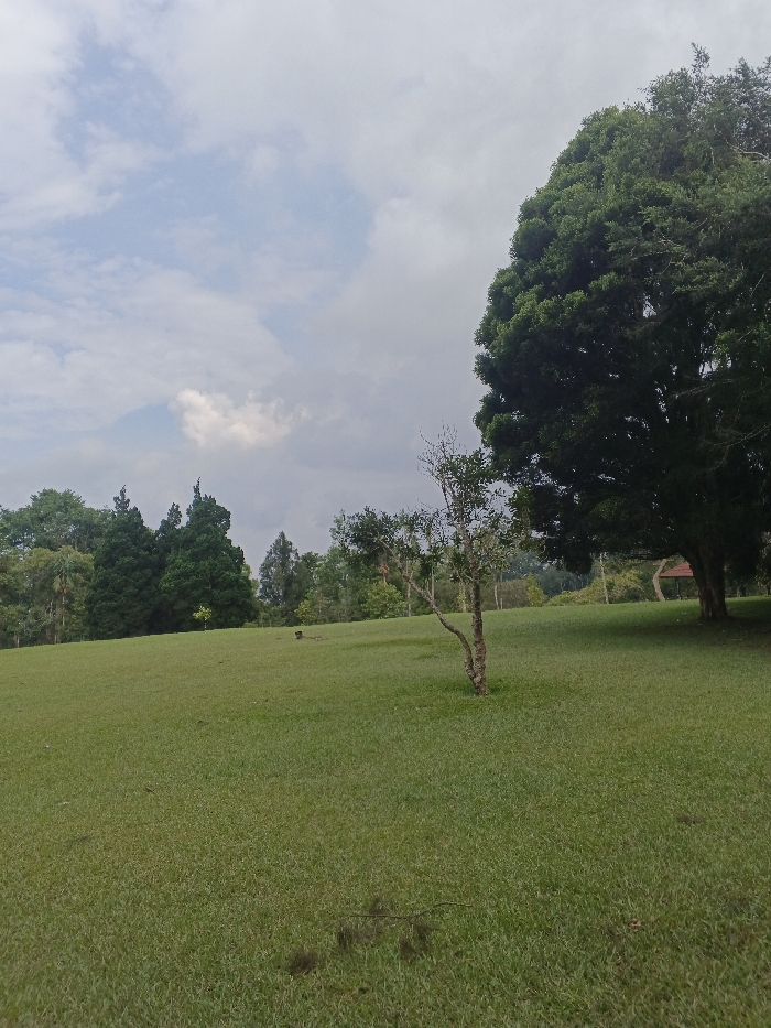 The scene depicts an expansive grassy field in Lalitpur, Nepal, under a partly cloudy sky with visible blue patches. The foreground and midground are covered by short, green grass, sloping gently upwards. A small tree with light-colored, multi-stemmed trunks and sparse foliage stands in the mid-right. On the grass in the lower left-midground, a broken branch with dark green needles is present. The background features a dense line of various trees, primarily dark green evergreens, extending across the left and center. A large, dark green, broad-crowned tree occupies the upper right portion of the image, partially obscuring a reddish-brown, open-sided structure with a gabled roof visible beneath its canopy to the far right. A small, dark, unidentifiable object lies on the grass in the mid-left background. No human figures or discernible actions are depicted.