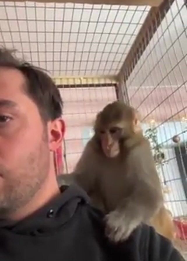 A video shows a man wearing a black hooded sweatshirt with a light-colored monkey sitting on his left shoulder