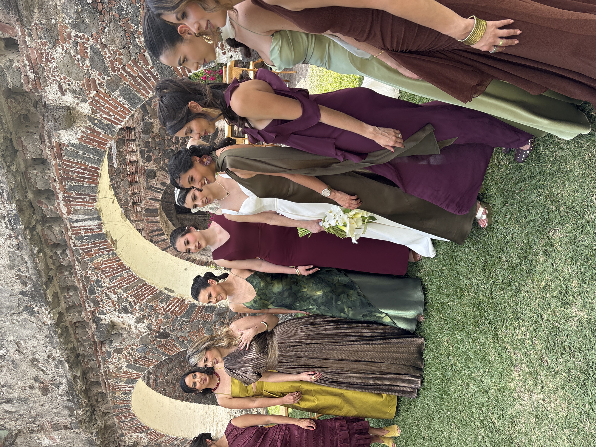 A group of eight women stand in a line, dressed in bridesmaid dresses of varying colors and styles, in Progreso, Mexico. The woman in the center holds a white flower bouquet and wears a white dress. Behind the group is a weathered stone arch. The ground is green grass.