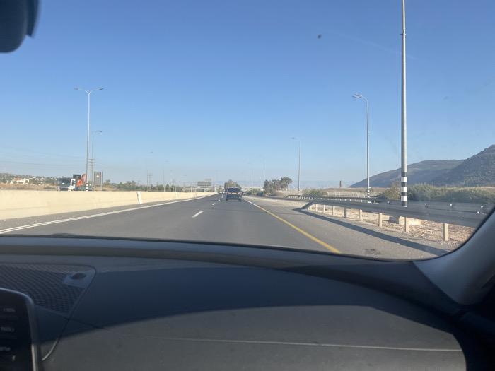 The image depicts a daytime scene from inside a vehicle looking forward through the windshield, with the top of the dashboard and a partial infotainment screen visible at the bottom. The vehicle is on a multi-lane asphalt highway, apparently in the left lane, indicated by a solid yellow line on the left and white dashed lines to the right. The sky is clear and blue. To the left of the vehicle's lane, a light-colored concrete barrier separates the main road from a parallel service road or access ramp. On this elevated section, multiple streetlights with modern fixtures are visible, along with a white truck featuring red accents parked or moving slowly. Distant buildings and a general industrial or residential area are visible beyond this section, followed by a hazy horizon. To the right of the vehicle's lane, a wider lane or shoulder is present, bordered by a metal guardrail. Beyond the guardrail, dry, light-colored vegetation grows on a gentle slope. Numerous tall streetlights line this side of the road, one prominently displaying black and white striped markings near its base. In the background on the right, a distinctive range of green and brown mountains rises. Ahead on the highway, a dark-colored SUV or car is visible in the right lane, followed by another lighter vehicle further in the distance. No specific individuals are discernible in the scene. This location is identified as **Highway 71** (כביש 71), within or directly adjacent to the **Gilboa Regional Council, Israel**, with the prominent **Gilboa mountains** forming the range visible to the south (right) side of the highway.