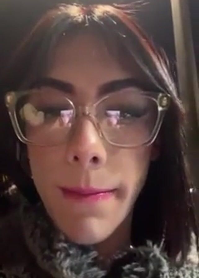 A close-up shot shows a person with long, dark hair and light skin wearing transparent, square-framed glasses. They have noticeable makeup, including pink lipstick and styled eyelashes. The person is wearing a dark, furry or textured coat. The background is dark, with some blurred lights and architectural details suggesting an outdoor urban environment at night. The camera is held at a slightly low angle, looking up at the person. The person is facing the camera and their expression is neutral.