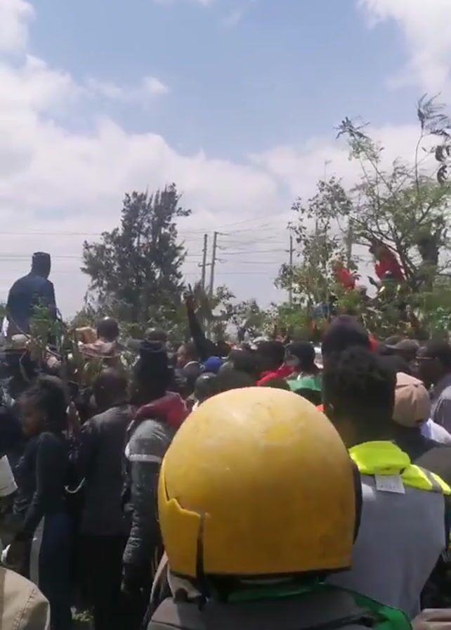 large crowd of people gathered in an outdoor setting under a partly cloudy sky. The view is from within the crowd, slightly elevated, with a person wearing a yellow helmet in the foreground. People in the crowd are wearing various clothing, and some are raising their arms. At least one person is holding a bundle of green leaves or branches up in the air. Trees and utility poles are visible in the background. It appears to be a celebratory or demonstration-like event.