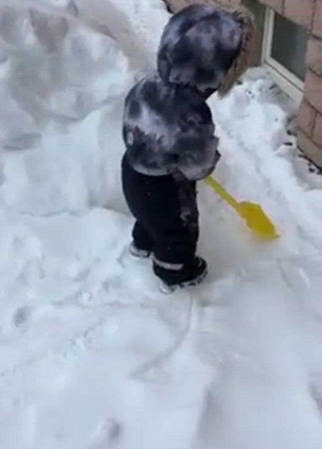 A toddler wearing a hooded snowsuit and gloves attempts to shovel snow near a brick building. The child struggles to manipulate the yellow plastic shovel effectively. There is a substantial layer of snow covering the ground, with drifts piled against the building. A small window is visible in the brick wall.
