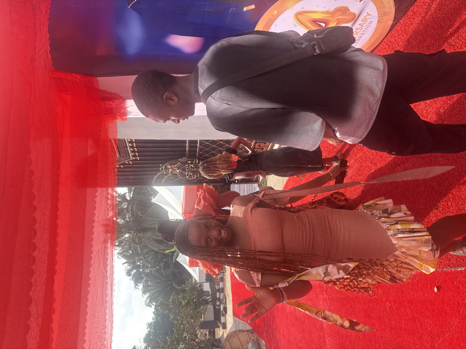 An outdoor event scene under bright daylight features a red carpet extending from the foreground into the background. A red, translucent fabric canopy is suspended overhead. In the foreground, a young female with light brown braided hair, wearing a form-fitting tan dress with a ruffled, patterned skirt and off-shoulder straps, smiles and waves at the camera with her right hand. She wears several bracelets on her right wrist. To her right, a young male, viewed from the rear-right, wears a dark grey short-sleeved top, black cargo pants, and a black messenger bag across his left shoulder. He is looking towards the female subject. A third female, with light-colored braids, is visible between them, facing away from the camera on the red carpet. In the background, an ornate dark metal gate is visible, along with multiple white event tents with red trim, and abundant green foliage, including palm trees. A blue and orange banner on the right side indicates an "NNIVERSARY CELEBRATION." The location is Aguata, Nigeria.