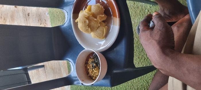A plate and a cup of food are placed on a black chair. The plate contains a mound of pale yellow, lumpy food. The cup holds a mixture of brown liquid and dark, chunky pieces on top of crumbled yellow food. A person sits in the chair, with their hands resting near their knees. The ground visible in the background is covered with green grass. A portion of a wooden surface is visible next to the chair.