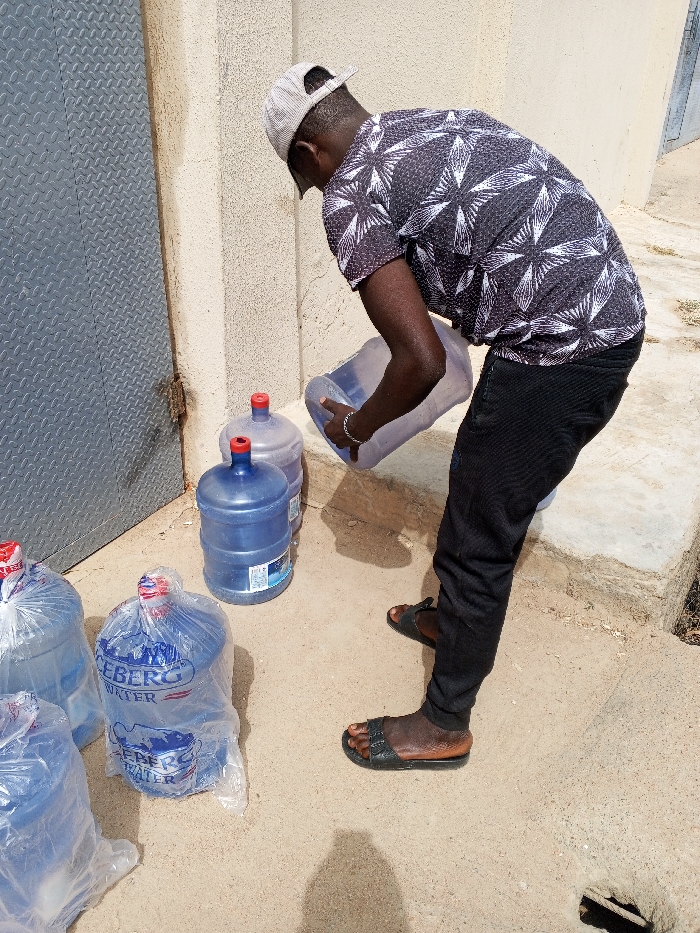 The scene, located in Hotoro South, Nigeria, depicts an outdoor environment under bright daylight. An adult male subject, dark-complexioned, is observed bending forward, holding an empty, clear plastic water gallon with both hands, tilting it downwards. He wears a reversed light-colored baseball cap, a black and white star-patterned short-sleeved shirt, black trousers, and black slide sandals. A silver-colored bracelet is visible on his left wrist. Situated on a light-colored concrete or sandy ground are five additional water gallons: two blue plastic gallons with red stoppers, one behind the other, and three clear plastic-wrapped gallons, one of which is labeled "ICEBERG WATER." To the left of the subject, a dark grey diamond-plate metal door or panel with a visible hinge is present. To the right and behind the subject, a light-beige textured wall is visible. Clear shadows are cast on the ground.