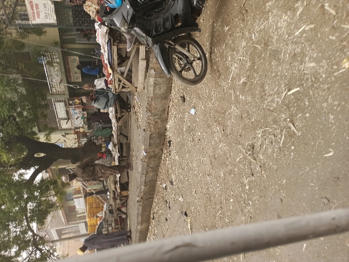 The scene depicts a bustling outdoor environment in Sabon Gari West, Nigeria, likely a market street, under an overcast sky. The foreground features an unpaved, dirty ground surface covered with scattered debris, including small white fragments and wood chips. A vertical grey pole partially obstructs the left foreground. A black motorcycle's front wheel and fender are visible on the right. Separating the unpaved ground from a paved sidewalk is a concrete curb. Along this sidewalk, numerous makeshift wooden stalls display various goods. On one stall to the right, red items, possibly meat, are laid out. A large tree with green foliage stands centrally, casting shadows. Multiple individuals populate the scene. On the left midground, a man in a light brown uniform or traditional attire walks from right to left on the sidewalk. To his left, another man in a long, dark robe and a yellow head covering stands near a vehicle partially visible on the far left, which carries yellow cargo. Further right, several men are present around the stalls. One man in a light grey jacket and dark cap is seated at a stall. Another man, dressed in a white robe and white head covering, is seated nearby. A man in a blue shirt is visible further back. On the far right, a man in a patterned top and dark trousers is seated next to the partially visible motorcycle. In the background, multi-story buildings line the street, featuring shopfronts with visible signage, including one that reads "A.S.D CAFE."