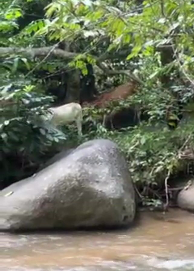 stream flowing through a lush, green forest. Several light-colored cows are grazing near the edge of the stream, partially obscured by dense vegetation. A large, smooth gray rock sits in the foreground, partially submerged in the water. The stream is flowing with a gentle current. The camera is positioned slightly above the water level, providing a clear view of the stream and the surrounding environment.