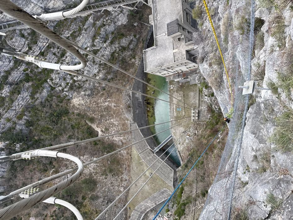 This image presents a high-angle, downward view into a deep valley near Castellane, France, featuring a hydroelectric facility at its base. In the foreground, multiple thick steel cables descend vertically from above the frame, creating a linear pattern against the steep, rocky cliff face. Below these cables, on the rugged grey rock, a single individual is visible. This person is wearing an orange hard hat and dark clothing, positioned on the slope, and appears to be engaged in work on an extensive grey wire mesh safety net that covers the rock face. They are secured by a prominent blue rope and a yellow rope, both extending further down the slope. An anchored metal plate, likely a fixture for the netting or a cable, is visible on the rock in the lower right corner. The immediate rock face shows sparse vegetation, including dry grass and small shrubs. At the bottom of the valley, a concrete dam or spillway structure is visible, containing two distinct bodies of water. Directly below the descending cables is a greenish, semi-stagnant pool. To its left, a clearer, turquoise-blue channel flows, indicative of a river or controlled waterway. Adjacent to the greenish pool stands a multi-story, utilitarian grey building with a flat roof and numerous windows, consistent with an industrial power station or similar facility. Concrete platforms and additional smaller structures surround the main building and the water bodies. The opposing side of the valley features another steep, layered rock cliff adorned with sparse trees and what appears to be a vertical access ladder or support structure extending up its face.