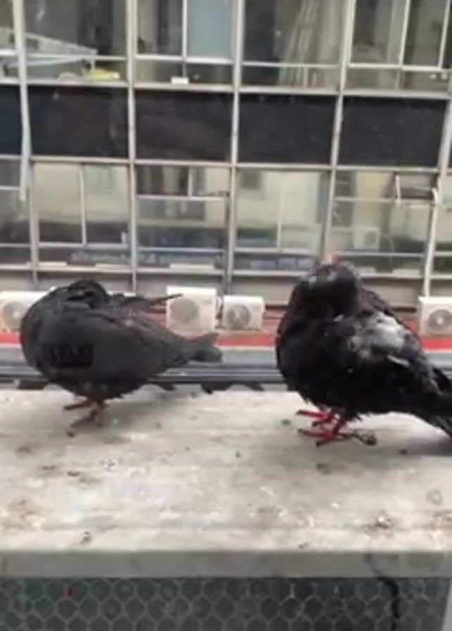 Two pigeons are perched on a gray, possibly concrete ledge in front of a window. Both pigeons are dark, seemingly black or gray, and have red legs. The pigeon on the left is preening its feathers, while the pigeon on the right stands still. The window behind them features a grid pattern of square panes and has air conditioning units visible on the exterior wall. The scene appears to be set in an urban environment. There is audio in the background.