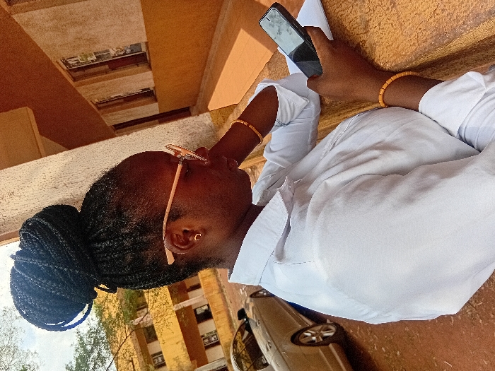 A young, dark-skinned woman with braided hair in a bun wears round glasses. She holds a cell phone in her right hand, while her left arm is bent. A light-colored vehicle is near her. She wears a white shirt and beaded bracelets on both wrists. The scene appears to be outdoors, near a building with yellow-colored walls and brown accents. The photograph is rotated, with the top of the image oriented towards the left.