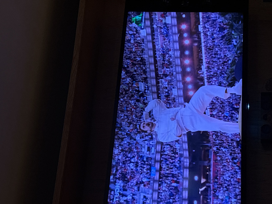 A TV screen displays a person in a white suit with a crowd in the background. The image is rotated, and the person appears to be walking through a large gathering. The crowd is densely packed and illuminated by overhead lights. The screen also shows logos in the corner and hashtags at the top.