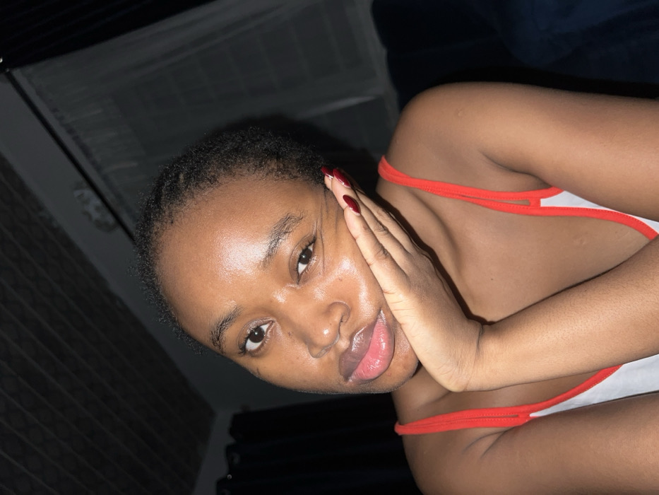 A young woman poses for a selfie. She's fair-skinned with dark hair pulled back from her face. Her right hand is gently touching her cheek. She's wearing a white tank top with red trim. The background is dark and slightly out of focus. Her lips are glossy and prominent. The image is angled, with the woman's face being the central focus.