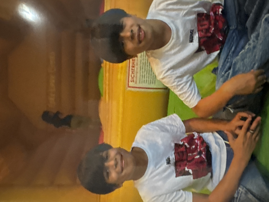 Two identical young men, wearing white T-shirts with a dark red and white design and blue jeans, are seated close together. They both have dark hair, are smiling, and appear to be in an indoor amusement area with yellow and green inflatable surfaces. A sign with German text is visible in the background. Another person is partially visible in the background, near a structure that looks like an inflatable slide or wall. The image has been rotated to the left.