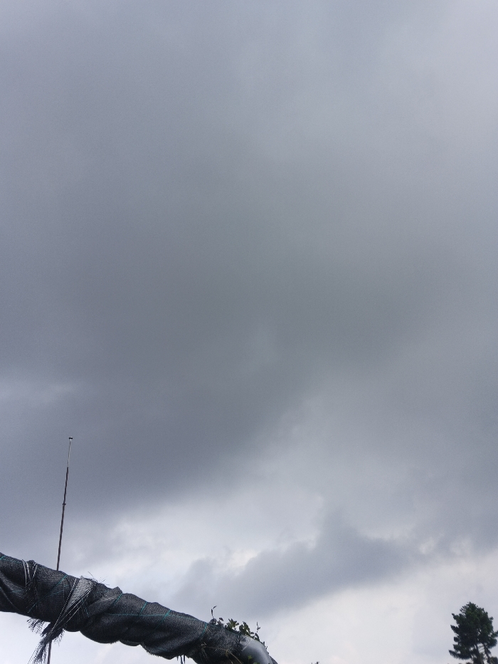 A gray sky dominates the scene, filled with thick clouds. A dark, textured net with green trim is visible in the lower left. A thin pole extends upwards into the sky. In the lower right corner, a tall, dark green tree can be seen. The overall mood of the image is somber and overcast.
