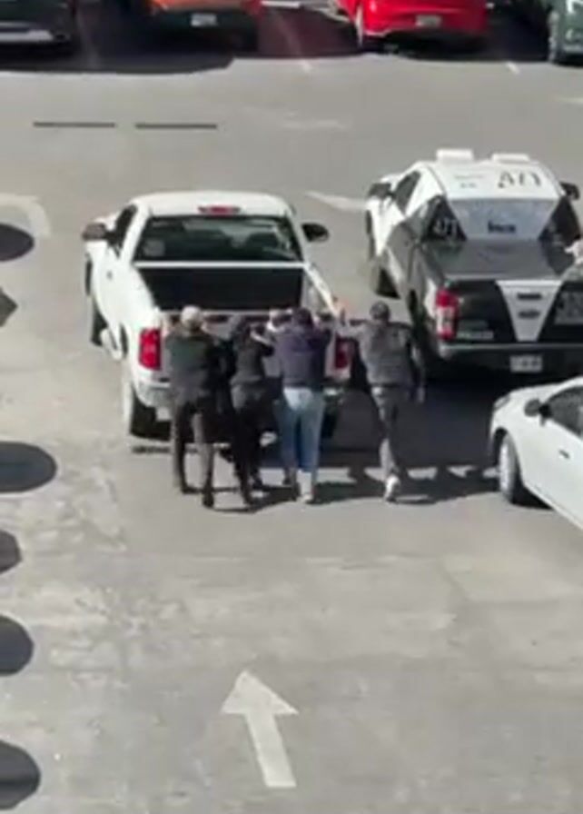 Here's a detailed description of the video: The video shows a parking lot scene with several cars. A white pickup truck is parked, and a group of five people is gathered around its open truck bed. Four of the individuals are dressed in black and appear to be pushing or placing a person in blue jeans into the back of the truck. The fifth person, wearing a black jacket and blue jeans, appears to be part of the group but is not directly involved in pushing the person into the truck bed. After placing the individual in the truck, the four people in black step away from the truck. Two of them, wearing caps, walk behind the truck. A black and white vehicle is parked next to the pickup truck. A uniformed individual can be seen standing next to the black and white vehicle. The environment is an outdoor parking lot, with painted arrows indicating the flow of traffic.