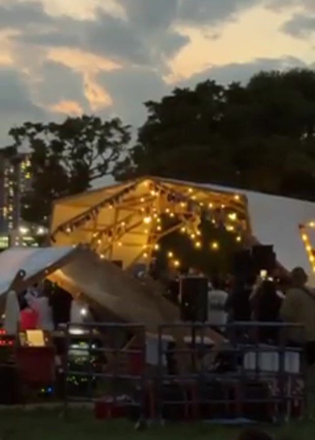 The video depicts an outdoor event taking place in a park or grassy area at dusk. A large, partially open structure, possibly a stage or shelter, is prominently featured. It is adorned with string lights, adding a warm glow to the scene. People are gathered around the structure, some appearing to be watching or listening to something occurring within the structure. Some individuals are holding up phones, possibly recording or taking photos. In the foreground, there are pieces of equipment, possibly audio or visual setup. Trees and a building are visible in the background. The sky is cloudy with hints of orange from the setting sun.