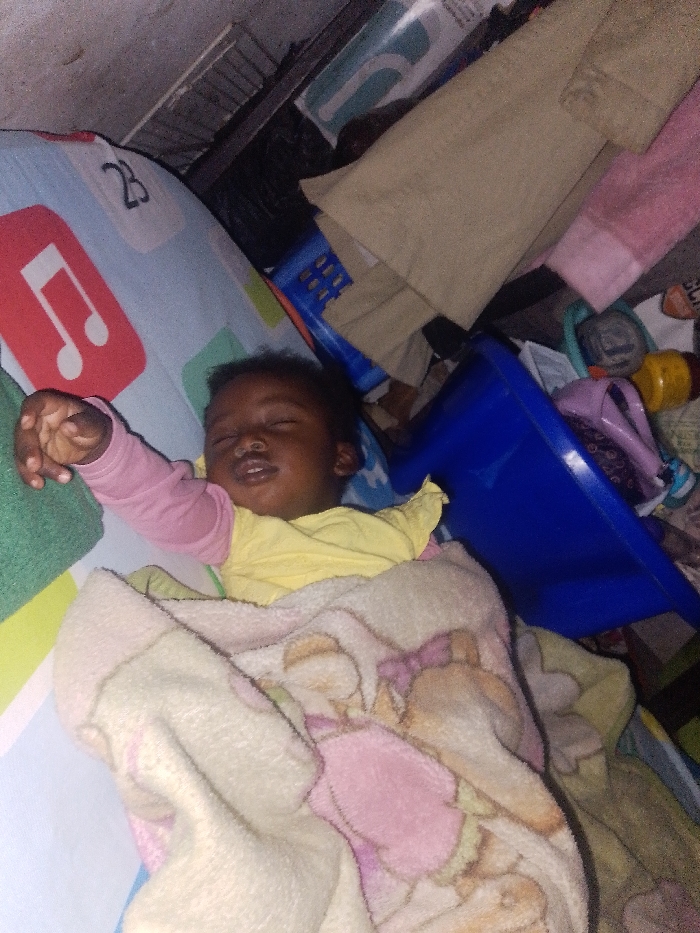 A small child with dark skin sleeps soundly on a blue patterned mat. The child is wearing a yellow shirt with a pink long sleeve underneath, covered partially with a cream-colored blanket featuring pink cartoon designs. A blue plastic tub sits nearby, along with various household items. The setting appears cluttered, with clothes and other objects scattered around the child.