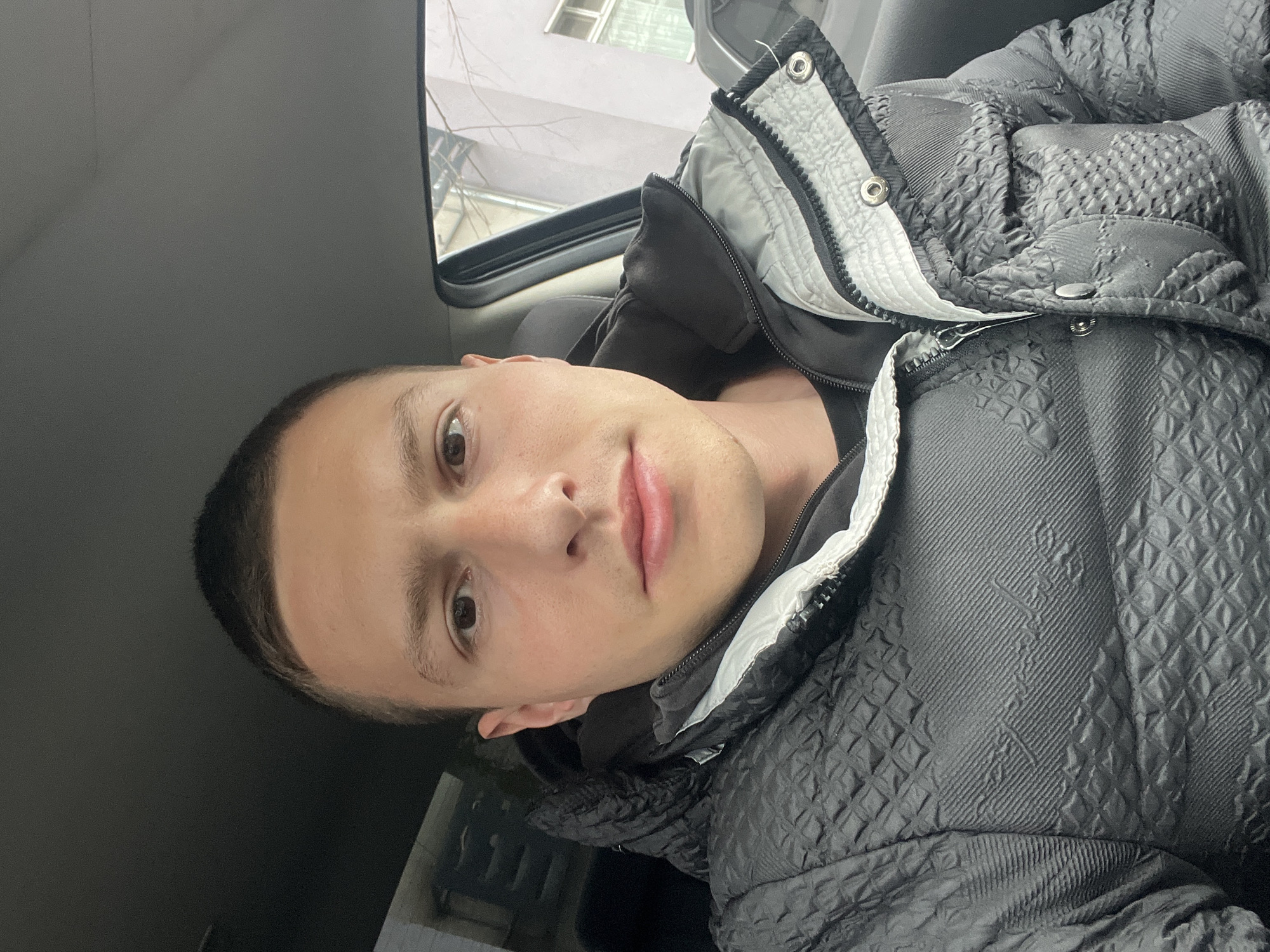 A young man with short, dark hair is seated inside a vehicle. He is wearing a black quilted jacket with a white lining. The vehicle appears to be stationary. A window shows a partial view of a building, potentially located in an urban area. While the image provides no definitive clues about the location, without more information, it's not possible to confirm it is in Burgas, Bulgaria.