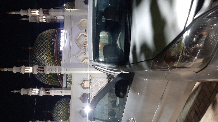 The scene depicts a light-colored sedan parked on a paved surface at night in Kotapantonlabu, Indonesia. The vehicle's front passenger door is open. Visible details of the car include its front passenger-side headlight, which appears to have condensation, and reflective surfaces. Directly behind the vehicle, a large, illuminated mosque stands prominent against the dark sky. The mosque is characterized by its white facade, multiple tall minarets with vertical strip lighting, and distinct green-domed roofs adorned with intricate patterns. No individuals are visible in the image.