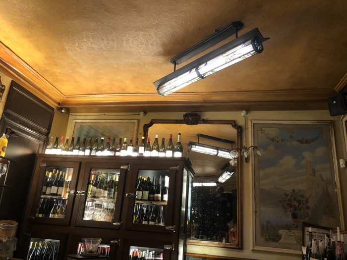 The image displays the interior of a traditional French restaurant, identified as Bouillon Chartier at 7 Rue du Faubourg Montmartre, 75009 Paris, France. The perspective is directed upwards towards the ceiling and across a wall, revealing an ornate and well-appointed dining space. The ceiling is a textured, mottled golden-yellow, bordered by a substantial dark wooden cornice. A prominent overhead light fixture extends diagonally from the top center, featuring a long, black metallic housing containing a fluorescent tube behind a decorative, possibly stained-glass, panel. The walls are painted a lighter yellow or beige above dark wooden paneling. On the left, a dark wooden structure, possibly a doorframe or partition, is visible. Below it, a yellow bottle rests on a surface. The central feature is a tall, dark wooden display cabinet with glass-fronted compartments, stocked with numerous wine bottles and glassware. Above this cabinet, approximately 25 wine bottles stand in a row, illuminated from beneath. To the right of the cabinet, a large, ornate mirror with a dark wooden frame reflects parts of the ceiling and the overhead light fixture. Adjacent to the mirror are two wall sconces with frosted glass shades. Further to the right, a large framed painting depicts a classical landscape featuring a castle atop a hill, clouds in the sky, a body of water, and a vase of colorful flowers in the foreground. Below the painting, a partial view of more wine bottles and various papers or menus is visible on a counter. A dark speaker is mounted high on the wall in the upper right corner. No people are visible in the scene.