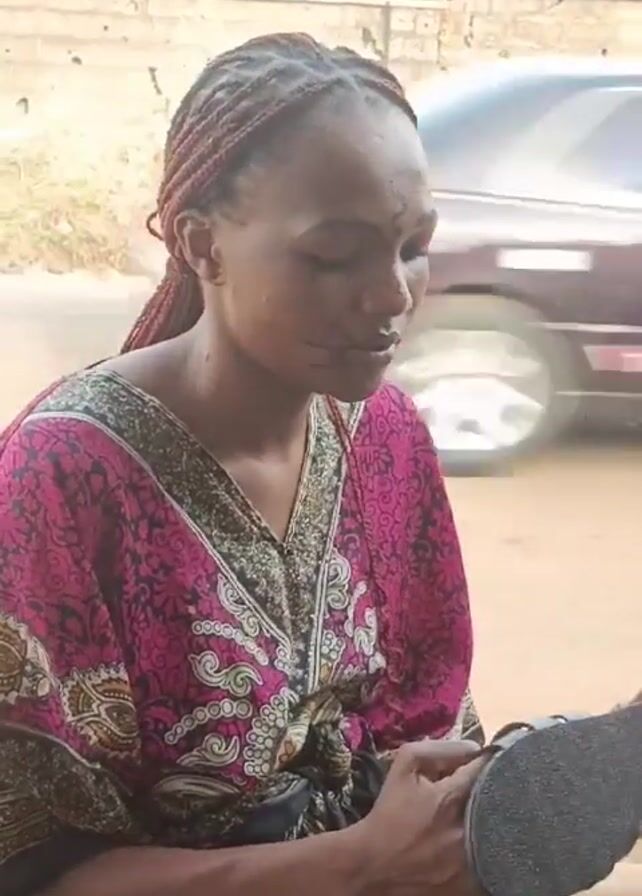 A woman wearing a pink and black patterned robe and braided hair is inspecting a black sandal. She has what appear to be facial markings. The background includes a wall, a street, and some greenery. A person walks by in the background.
