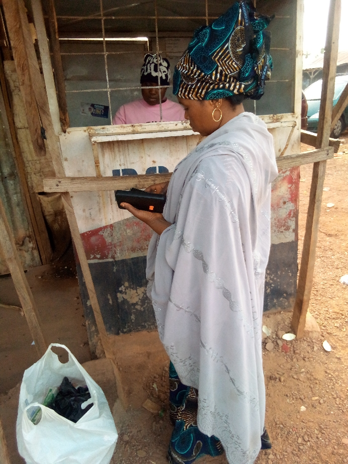 A woman in a patterned headwrap and light gray shawl holds a mobile payment device. She stands outside a small, weathered building with a barred window. Inside, another person wears a dark hat and pink shirt. A plastic bag filled with dark items sits on the ground near the woman. The setting appears to be an outdoor market or roadside.
