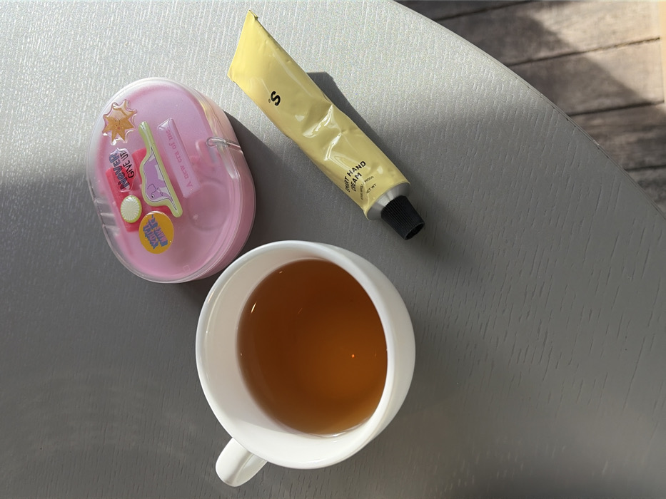 A top-down view shows a gray tabletop with a pink container, a yellow tube of hand cream, and a white cup of tea