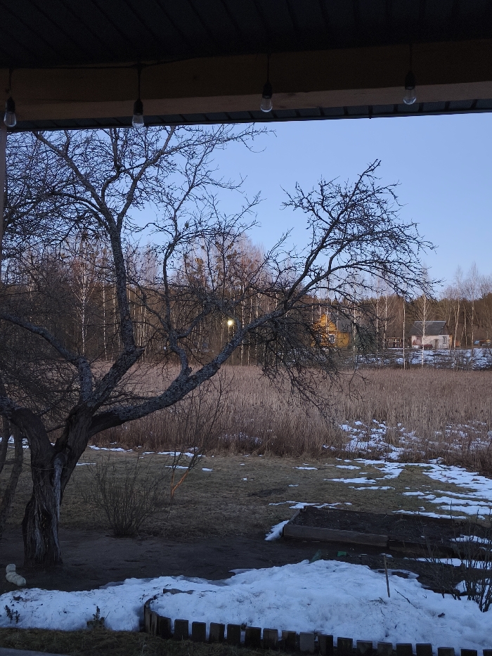 The image depicts an outdoor, semi-rural scene in Парэчча, Belarus, viewed from under a dark wooden overhang. Three exposed light bulbs hang vertically from the overhang. The ground in the immediate foreground consists of dark earth and irregular patches of melting snow, bordered by a low wooden fence segment at the bottom right. A large, gnarled deciduous tree with dark, bare branches occupies the left mid-ground, extending towards the center. Beyond the tree and the remaining snow, a field of dry, light brown grasses or reeds stretches into the background. In the distant background, a yellow two-story house with a dark roof is visible through a line of bare trees, situated to the right of a discernible street light. A smaller, lighter-colored building with a reddish roof is partially visible to the right of the yellow house. A dense forest line forms the horizon beneath a clear, light blue sky. No individuals are present.