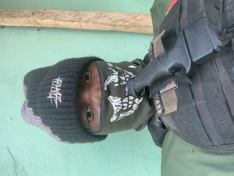 A person in a black and grey knit cap with a Stussy logo, and a dark green face mask with a skull design. The individual's eyes are visible. They wear a tactical vest with various straps and patches. A black object, possibly a weapon or holster, is attached to the vest near the person's shoulder. The background appears to be a green wall and a wooden plank.