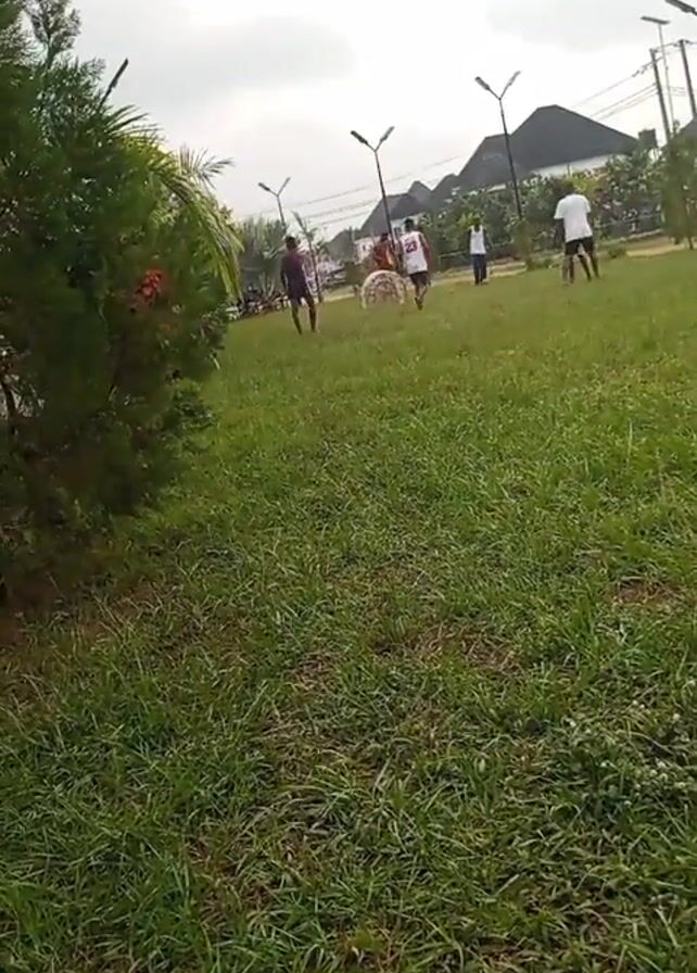 A group of young men are playing soccer on a large grassy field. There are approximately seven individuals visible in the frame. They are wearing various casual clothing items, including jerseys and t-shirts. The grassy field is surrounded by trees and lamp posts. In the background, there are houses with dark roofs. The sky is overcast. The camera is relatively stationary.