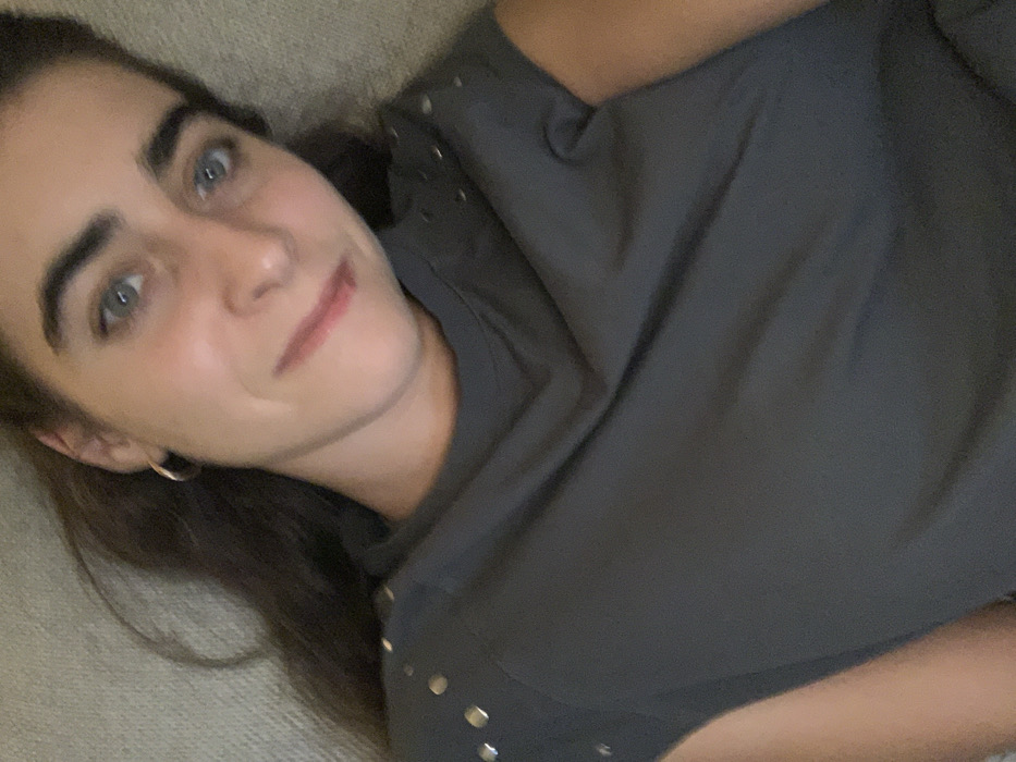 A young female, appearing to be in an indoor setting, is depicted in a close-up, high-angle selfie-style photograph. Her head and upper torso are visible. She has light skin, long dark hair, prominent dark eyebrows, and blue-green eyes. A subtle smile is present on her lips. She wears a dark grey short-sleeved top, which features multiple small, circular, silver-toned studs on both shoulders. A simple, small, silver-toned hoop earring is visible on her left ear. The background consists of an indistinct, light-colored, textured fabric surface, possibly upholstery. No specific geographic identifiers for Lisbon, Portugal, are discernible within the image.