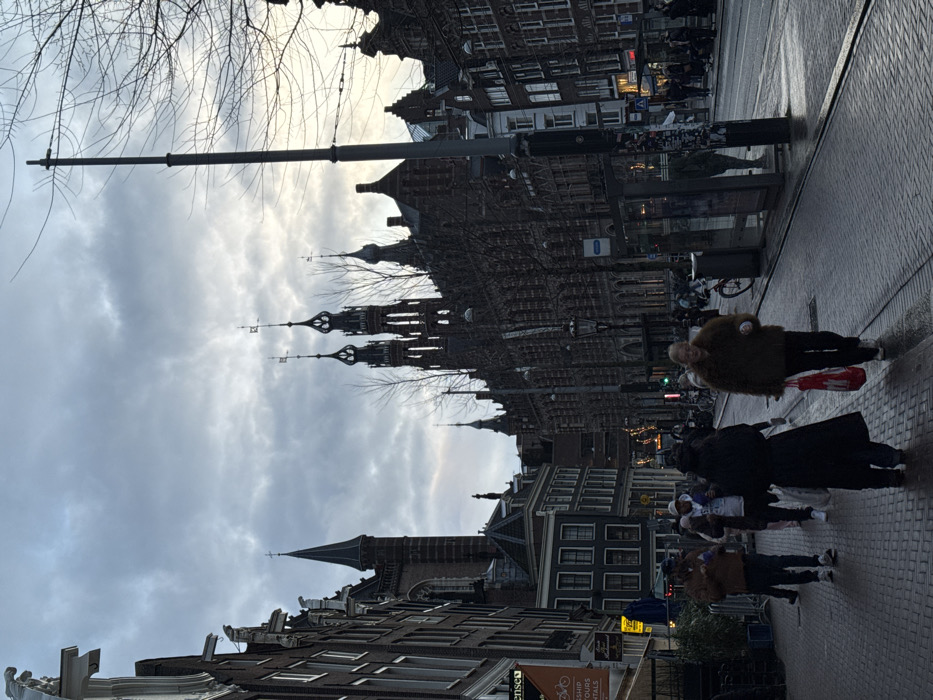 An Amsterdam street scene shows tall, narrow buildings under a cloudy sky. People walk along a brick sidewalk, and bicycles are parked near a bus stop. Notable landmarks include a church spire and a distinctive building with multiple pointed towers. Bare tree branches frame the upper part of the image. The lighting suggests it might be dusk or a cloudy day.
