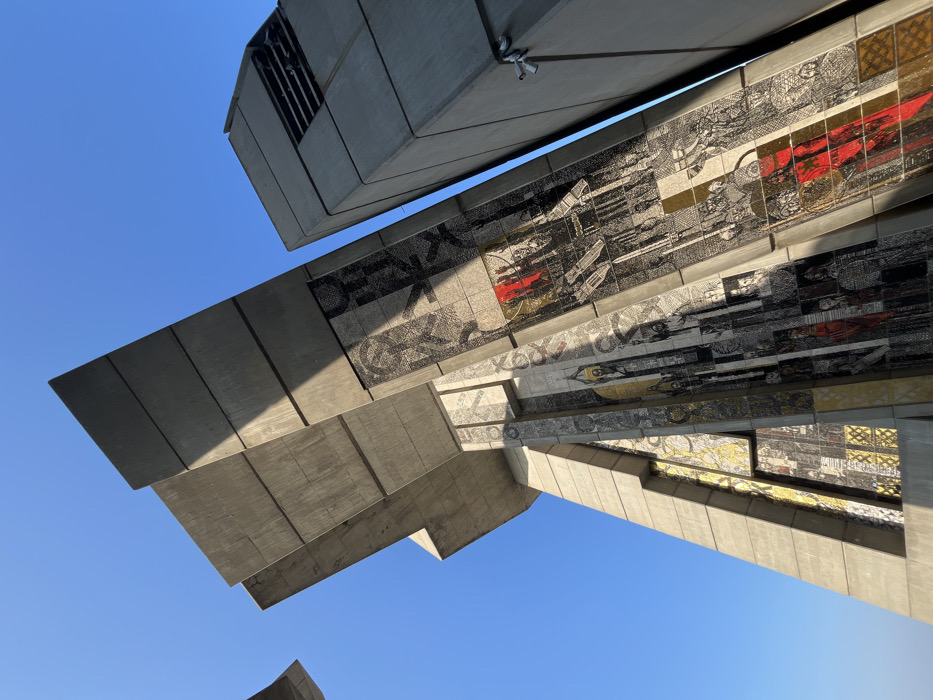 The image displays a low-angle view of the Monument to 1300 Years of Bulgaria, located on a plateau above the city of Shumen, Bulgaria. The structure consists of massive, angular concrete blocks forming a brutalist architectural style. The monument is composed of multiple upright and cantilevered concrete elements, creating geometric voids and imposing forms against a clear, bright blue sky. Prominently featured are large mosaic panels integrated into the concrete surfaces. These mosaics depict a rich tapestry of historical figures, symbolic representations, and abstract patterns, primarily in shades of grey, black, white, gold, and red. Portions of Cyrillic script are discernible within the mosaic designs. Sunlight illuminates the scene from the left, casting sharp, diagonal shadows across the concrete and mosaic surfaces, enhancing the monument's three-dimensional geometry. On the rightmost vertical concrete tower, two light-colored security cameras are mounted, pointing outwards. No people or specific actions are visible within the frame. The overall impression is one of monumental scale and historical commemoration under an open sky.