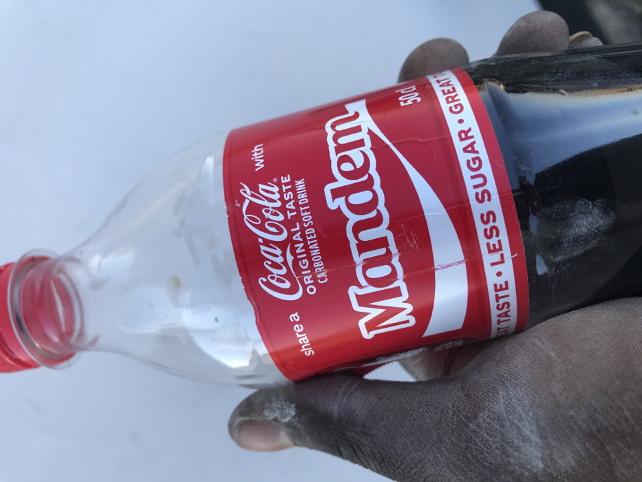 A partially filled Coca-Cola bottle, with the label reading "Coca-Cola with Mandem," rests in a person's hand