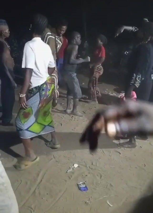 group of people dancing outside at night. The ground is sandy, and there are cigarette packs scattered around. A person in a red baseball cap is smoking a cigarette. The dancers are wearing casual clothes and seem to be having a good time. There is one person, possibly a child, who appears to be covered in something dark. The lighting is dim, making it difficult to see the people's faces clearly.