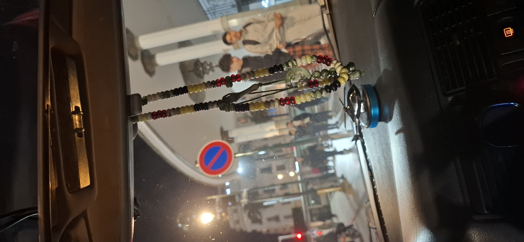 A reflection in the rearview mirror of a vehicle parked on the street in Rabat, Morocco shows two people walking along a sidewalk. One person is wearing a light-colored jacket and the other a plaid shirt. A "No Parking" sign is also reflected in the mirror. A string of beads is hanging from the rearview mirror, and interior car details are visible.
