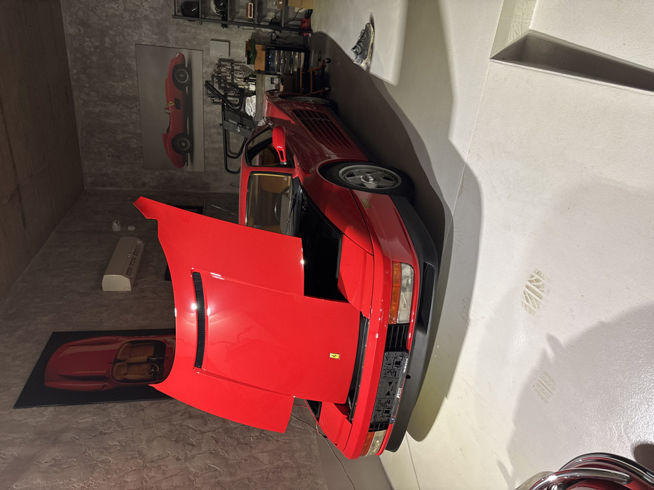 The scene captures an interior view of a garage or workshop, located in Ivanyane, Bulgaria. A bright red Ferrari Testarossa, positioned centrally, dominates the foreground. Its front hood is fully raised, exposing the front storage compartment. The vehicle's front bumper is black, and a black license plate holder with white text and a small Bulgarian flag emblem is affixed. The interior of the Ferrari is tan. The surrounding walls are finished with a grey, textured material, and the floor is a light grey, possibly concrete, exhibiting distinct tire tread marks near the front of the vehicle and a recessed section to the right. On the left wall, a large, vertical framed print depicts a red classic car from an aerial perspective. Below it, a white air conditioning unit and a small white security camera are mounted. The rear wall displays a horizontal framed print featuring a red classic racing car. To the right of the Ferrari, a workbench area with shelving holds various tools and equipment, including what appears to be a red trolley jack. A pair of grey sneakers rests on the floor in this vicinity. In the bottom-left corner of the frame, chrome bumper elements and red bodywork of a second vehicle are partially visible. No individuals are present in the image.